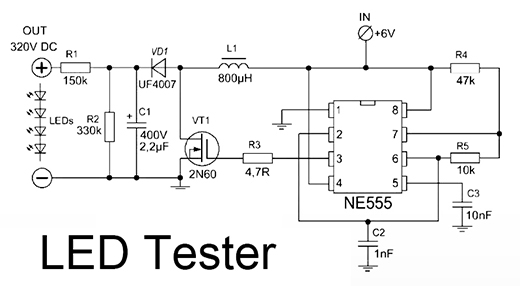 網路上找到這個零件不多的LED測試器電路圖..