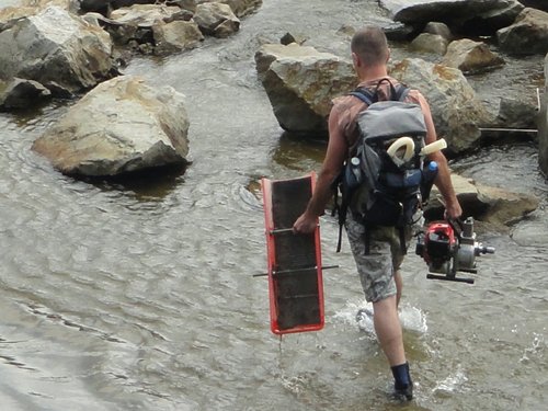 淘金季節吸引力 2013-06-09 尋金探礦 河岸邊, 今日來了位在地的新朋友 “阿法”, 在沒有足夠的裝備下, 與女友舉步維艱地涉渡河床, 親手挖材料搖盤子, 體會了人生第一次的淘金經驗… 回程時, 看到一位重裝備淘友剛剛下切河床… 老實說… 牛還蠻不願意見到有機具進入河床的說… 用人力淘, 能淘多少? 又能有多大的破壞性?? 真的要請大家守守規矩! 免得哪天又被關切到, 又好一陣子不能淘!! 聽說昨天淘友 Karven 淘出不錯的成績, 打響了開春第一炮!! 淘金季節… 正式開跑囉~ 吽!!