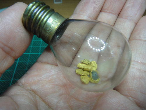 傳統燈泡砂金瓶 2013-04-17 收納製作 剛剛逛論壇時, 看到壇友把傳統燈泡做成了個小瓶子… 想到手邊也有一些汰換後用不到的E17傳統燈泡… 當然就要給它手賤一下囉~ (笑) 噹噹! 拿燈泡瓶來裝金金也是不錯看的喔! 趁著還沒變天, 排了一天休假去泡水… 雖然說氣溫回昇有點太陽… 但下水還是會冷的… 還好一天下來, 成績還算不錯! 吽~