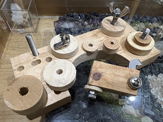 裁下來的圓木塊+掃回來的不鏽鋼螺絲+松果研磨輪