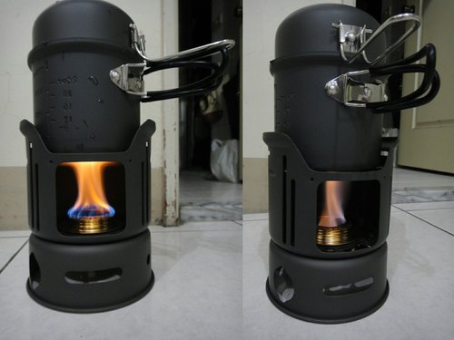 出門前一晚, 在家做了燃料煮水實驗… (酒精/圖左, 臘塊/圖右)