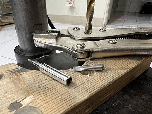 用壓力鉗夾住烙鐵頭, 上鑽檯..
