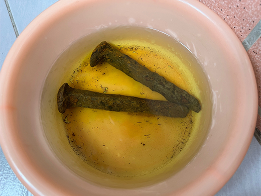 將要處理的道釘, 丟進檸檸酸裡泡一天.