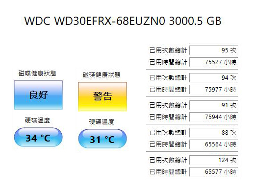 撤換下來的3TB硬碟, 有2顆出現了健康狀態警告..