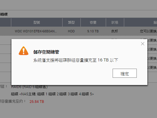然後把NAS原有的硬碟群組刪掉、重新建立RAID6(10TBx4)