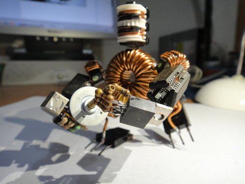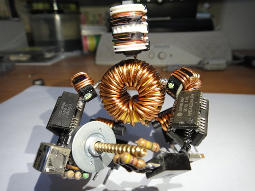 拆件機器人十一 2011-12-11 手創製作 這二天在家卯起來清理一些壞掉的電子產品… 能回收的部份, 都集中去做資源回收~ 主要的電路板, 零件就都拆下來做維修備料!! 在拆件的零件歸類整理後…. 一時興起… 又動手黏起了拆件機器人… 噹噹!! BR-11 (Boring Robot No.11) 端著武器 (軟碟機步進馬達) 跑步的樣子…. 有沒有像阿凡達裡的裝甲機器人?? 吽~