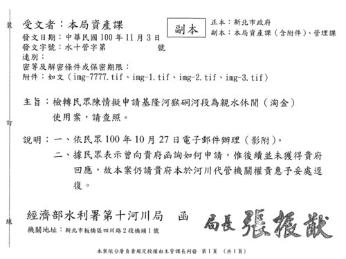 上星期收到十河局轉發給新北市政府的公文副本,