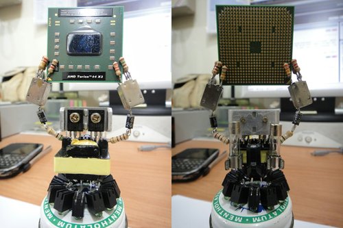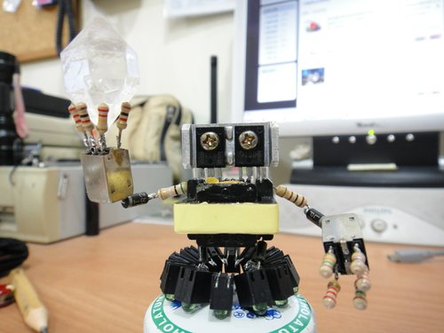 拆件機器人八號 2011-11-13 手創製作 下午拆解保養Goot PX-10, 順手拆了些零件試溫… 就這麼東拆西湊北拔南翻, 結果… 又湊出了隻小八… BR-8 (Boring Robot No.8) 強健的手腕取材自 “可調式中週電感”… (這東西~ 不好找了!!) 由於沒有做腳的材料.. 這次採用一圈LED做滑行腳.. 後置二支可拆玻璃保險絲~ 背心安的~~ 超微那也有好朋友~~ 就幫AMD打打廣告吧~~ (笑)