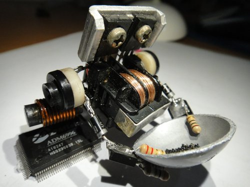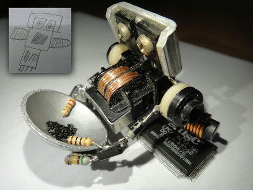 拆件機器人五號 2011-11-07 手創製作 晚上, 和小牛拿著幾個零件比劃著構圖.. 小牛貼心的畫出了小五的雛形~ 由於是立體架構, 製作時牛有小修改了一下… 噹! 噹!! 噹!!! 噹!!!! BR-5 (Boring Robot No.5) 報到! 這一盤都是黑砂 (磁鐵礦)… 再看看下一盤有沒有機會唄~ 吽!