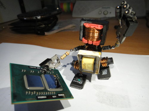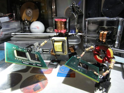 拆件機器人四號 2011-11-06 手創製作 昨天返修一台ASUS M5N, 回焊板上的BGA記憶體時失手了… 沒注意到記憶體要一顆一顆輪流用熱風槍加熱/冷卻… 過程中一顆BGA記憶體就這麼被吹了起來~ 糗大了現在… 等侯痞友 (痞酷) 的回應時, 完成了 BR-4 (Boring Robot No.4) 小四和小三剛好湊成一對, 一個拿CPU/NB, 一個搬SB… 超搭!