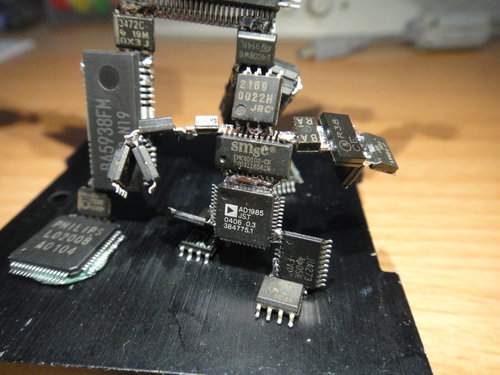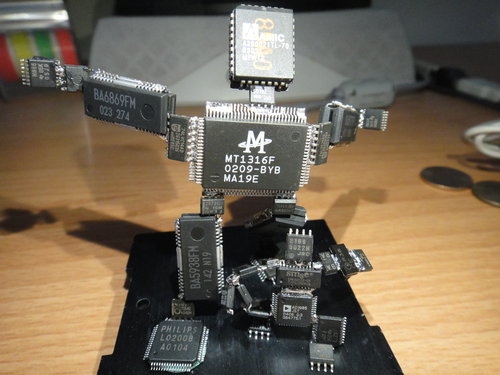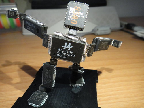 無聊の即興創作 2011-10-23 手創製作 外頭明明是出了個大太陽的好天氣… 但就算是去了基隆河, 沒能帶上 大藍 和 六角盤.. 也祗能望河興嘆… 拿著老魯的熱風槍, 練習手感…. 想著想著, 索性將這些拆件晶片 “黏” 成個人形~ 隨意吹件~ 隨便黏黏~ 沒有設計~ 打發時間!! Boring Robot No.1 Boring Robot No.2 再悶個幾個星期…. 可能會愈做愈大隻也不一定… (笑) 無聊~~ 想到啥就做啥~~ 有構思就去拆拆零件… 在不花錢買零件的前提下, 看看能拼裝出什麼樣的作品… (苦笑)