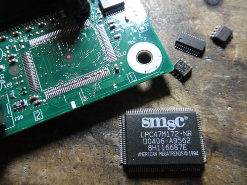 機板維修新利器 2011-10-19 資電維修 雖然說牛是 工業電子/數位電子 混完高工畢業的, 卻在一年前才偶然發現 “吸錫線” 的好用… 進而焊功大躣進! 不然, 修小板的時候, 那個鍚真的搞得是一團糟…. 由於未來 “可能會有很多時間” 關在家中練功, 老魯無償的借了隻400W熱風槍給牛玩~~~ 媽媽咪呀!! 熱風槍真的是太好用了…. (沙灘飛奔狀) 連Super IO都可以吹得下來~~~ 拆件拆上癮了現在~ 吽! 吽!! 吽!!