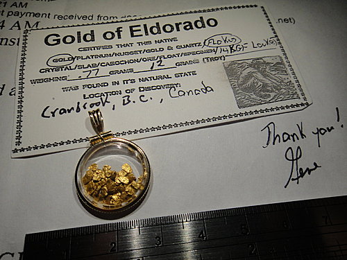 加拿大砂金鍊墜 2011-06-05 金礦標本 入手 加州砂金の鍊墜 沒多久, 又看到這件鍊墜… 金價狂飆… 就加減買來收唄… 吽~ 收藏日期: 2010/05/25 – eBay : egm947 (Gene Ralph) 標本產地: Cranbrook, B.C., Canada. 標本總重: 0.77g