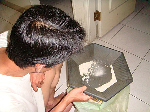 在家練習搖盤子 2011-05-18 生活札記 疑? 牛的搖盤技術還需要再精進嗎?? 還是閉關在修練搖盤秘技??? 難道? 牛改變目標?? 未來專淘細金金??? 是的… 牛是在家淘金沒錯!!! 淘的是 “鼠砂裡的黃金”….. (笑)