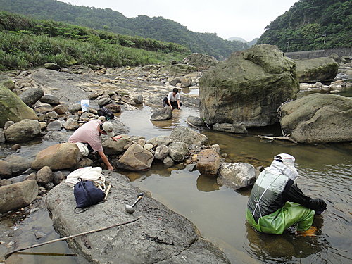 五一補假溼金瘋 2011-05-02 尋金探礦 看看~~ 台灣的經濟奇蹟就是由這些不肯休息的勞工所撐起~ 平日上班, 假日加班, 補假日還搶著打零工…. (汗) 老魯和候鳥還算正常… Loka的青蛙裝內早就裝滿了水… 人肉小山貓在上游處捨不得出水呼吸… 阿問根本是泡在水裡洗澡… 岸邊今天來了三位參觀淘金作業的觀眾… 牛在想… 淘班成員也算得上是基隆河觀光資源了… 在台灣, 應該找不到人做現場搞笑淘金表演吧? (笑)