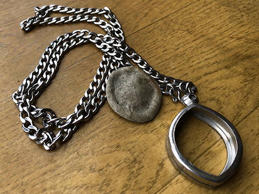 將大漢溪的餅乾海膽清清修修, 鑲進裝臟的鋼鍊鍊墜內,