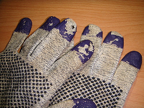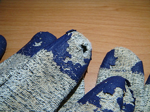 耐磨手套也磨破 2010-10-04 生活札記 牛大力推鑒的 KleenGuard G60, 在牛不懈的操作使用下… 仍然是給它磨破了… 耐磨損第四等級的 KleenGuard G60, 下水十來次後, 發現中指磨損破了個小洞.. 還好… 手套不分左右手….先交換手戴, 然後.. 再翻過來戴… 應該… 還可以再撐一陣子吧~~ 吽!! — 2010/10/24 二隻手套的中指都破了. 打算添購 KleenGuard G40 試試..