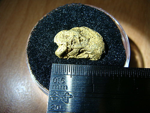 這顆基隆河塊金標本: 高13mm, 寬10mm, 厚4mm, 重1.96g