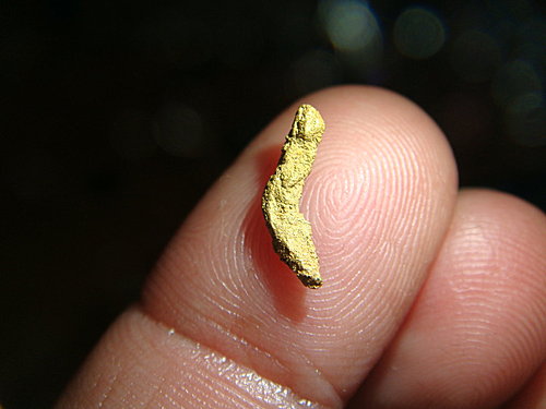 長條狀の自然金 2010-03-27 尋金探礦 荷薄今天領了四位朋友前來基隆河體驗洗涮涮… 大家陸續離開後.. 河邊就剩一位 “阿鋐” 還不死心的奮鬥著… 二個人一邊聊天一邊挖… 然後這條金金就跳出來了…. 這是牛第一次撿到粗的長條狀自然金… (樂) 因為工具操作不甚… 右手食指內側的皮被削掉了0.0xg (痛) 在灘地上淘金總是對牛的手指造成傷害… (主要是破皮) 但讓牛樂此不疲的是 “永遠有想不到的自然金被挖掘出來..” 吽~
