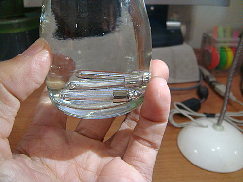 2010/01/09: 玻璃膠在80~90度水中會軟化, 回到常溫後會硬化.