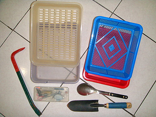 拿來挖盛砂石的鏟子/湯匙, 以及用來挖鬆石頭的鐵棒..