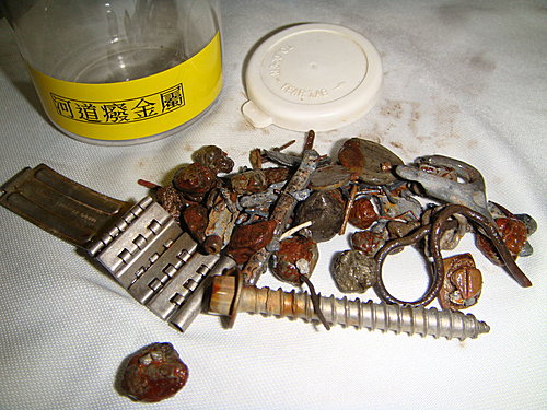 魚勾, 鉛塊, 鐵塊, 鐵釘, 刀片, 剪刀, 碎磁碗, 砰玻璃, 廢五金…..