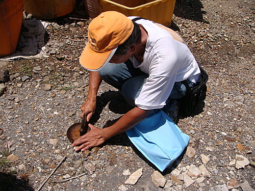 張大哥二話不說, 隨手找了顆石頭表演淘金…